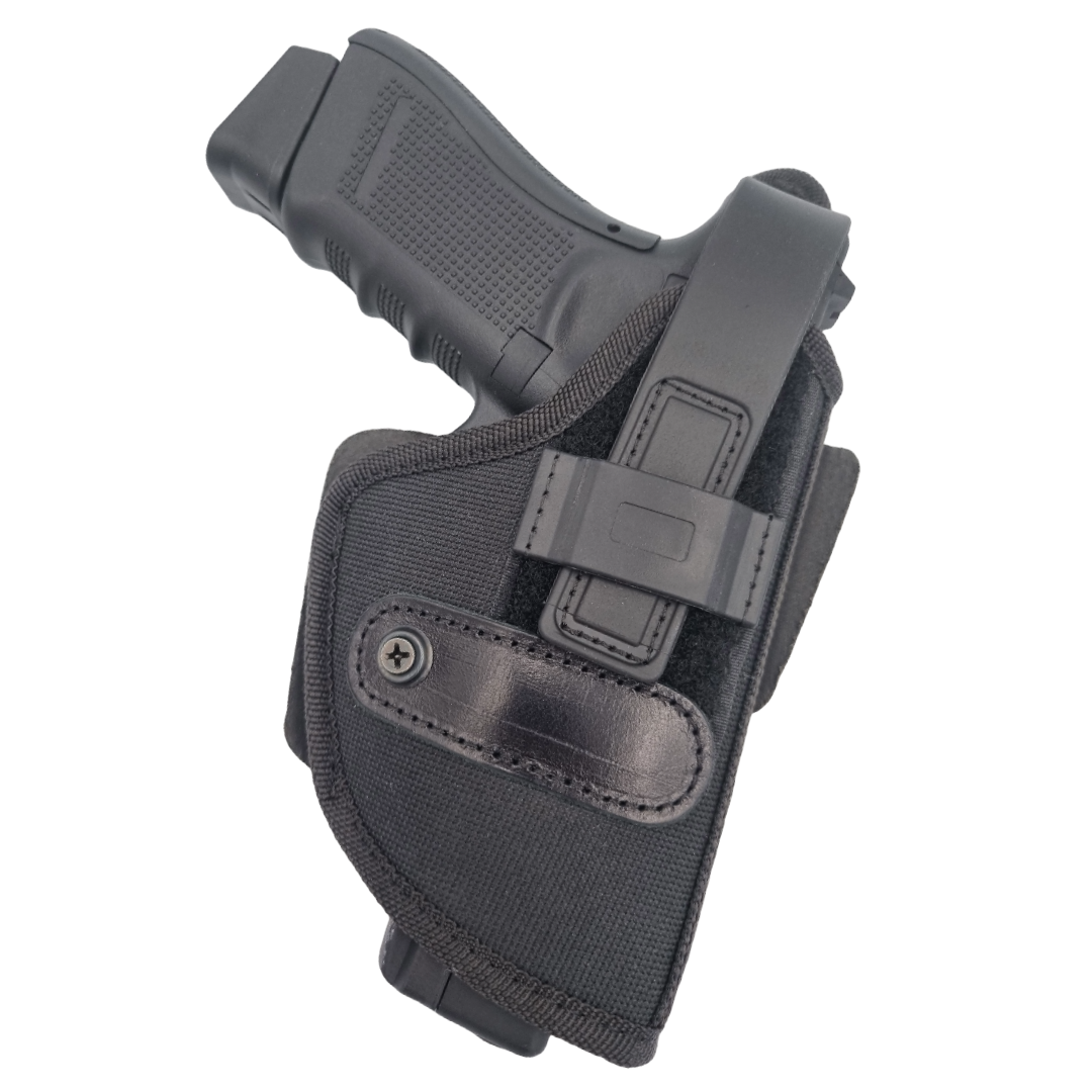 Toc pistol universal AKAR® din poliester cu prindere pe centură de tip OWB (Outside the Waistband) este un produs de top, conceput pentru utilizatorii profesioniști și civili care caută o soluție eficientă și sigură pentru purtarea armelor în calibru 9 mm sau .45 ACP. Proiectat pentru a se adapta la o gamă largă de arme cu țeavă scurtă, acest toc este compatibil cu modele populare precum Glock, Beretta, HK, SIG Sauer, HS, Fort, CZ și alte arme similare ca dimensiuni. Fabricat din poliester de înaltă calitate, acest toc oferă o combinație excelentă între durabilitate, confort și accesibilitate rapidă.